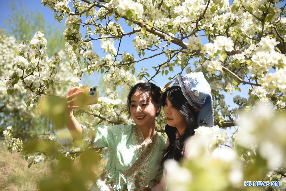 26일 관광객들이 간쑤(甘肅)성 린샤(臨夏)후이(回)족자치주 허정(和政)현의 배 과수원에서 꽃을 감상하며 기념촬영을 하고 있다.