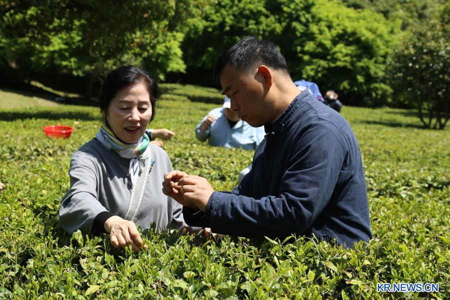24일 찻잎을 따고 있는 탕 대가. (사진/신화통신)