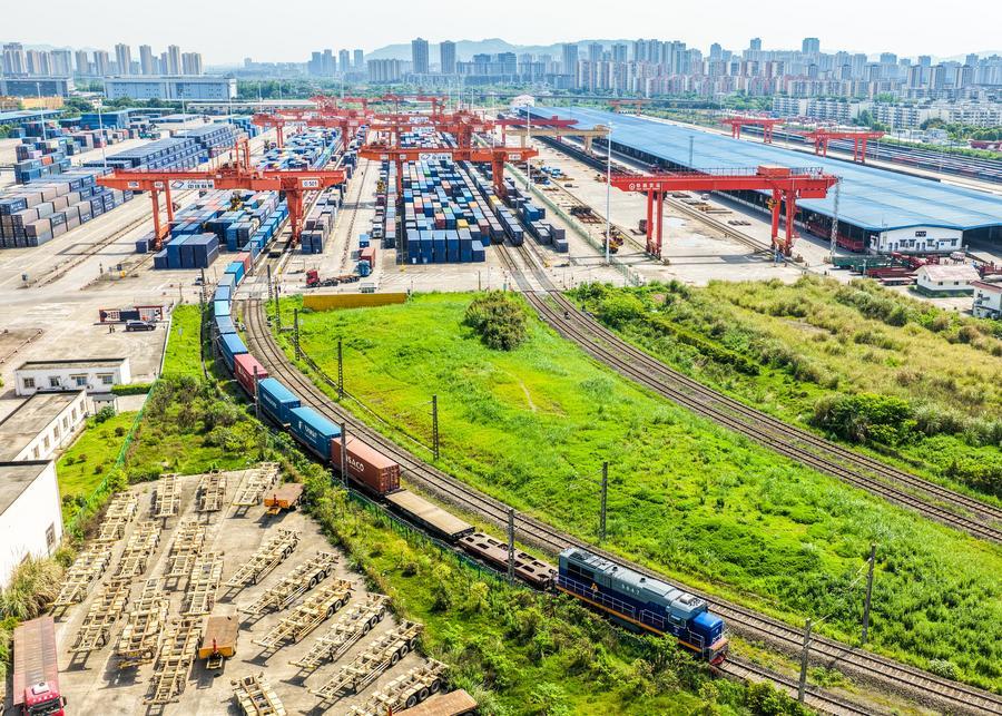 지난 23일 충칭(重慶) 퇀제(團結)촌역에서 출발하는 중국-유럽 화물열차를 드론으로 내려다봤다. (사진/신화통신)