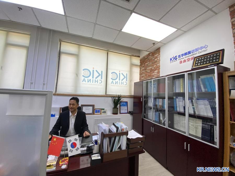 지난 21일 베이징 중관춘(中關村)의 사무실에서 근무 중인 김종문 센터장. (사진/신화통신)