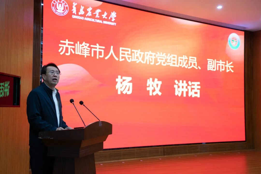 赤峰市政府党组成员、副市长杨牧对研究院的成立表示热烈祝贺,对青岛农业大学长期以来给予赤峰市农牧业科技事业的支持表示感谢。他指出,青岛农业大学内蒙古创新研究院的成立,是深入落实“科技兴蒙”行动、推动鲁蒙科技协作的又一标志性成果。内蒙古作为国家重要农畜产品生产基地和北方重要生态安全屏障,正处在转型升级、加快发展的关键时期。青岛农业大学在草牧业、现代种业、智慧农业、盐碱地治理、农畜产品加工等领域具有鲜明特色和雄厚实力,与内蒙古的产业需求高度契合。近年来,双方合作成果丰硕,青岛农业大学的专家团队扎根内蒙古大地,把论文写在田野草原上,为赤峰市农牧业提质增效和农牧民增收作出了重要贡献。他表示,赤峰市委、市政府将全力支持研究院建设发展,做好服务保障,优化发展环境,为研究院科研计划项目、创新平台建设、人才团队引育、成果转移转化等提供支持。