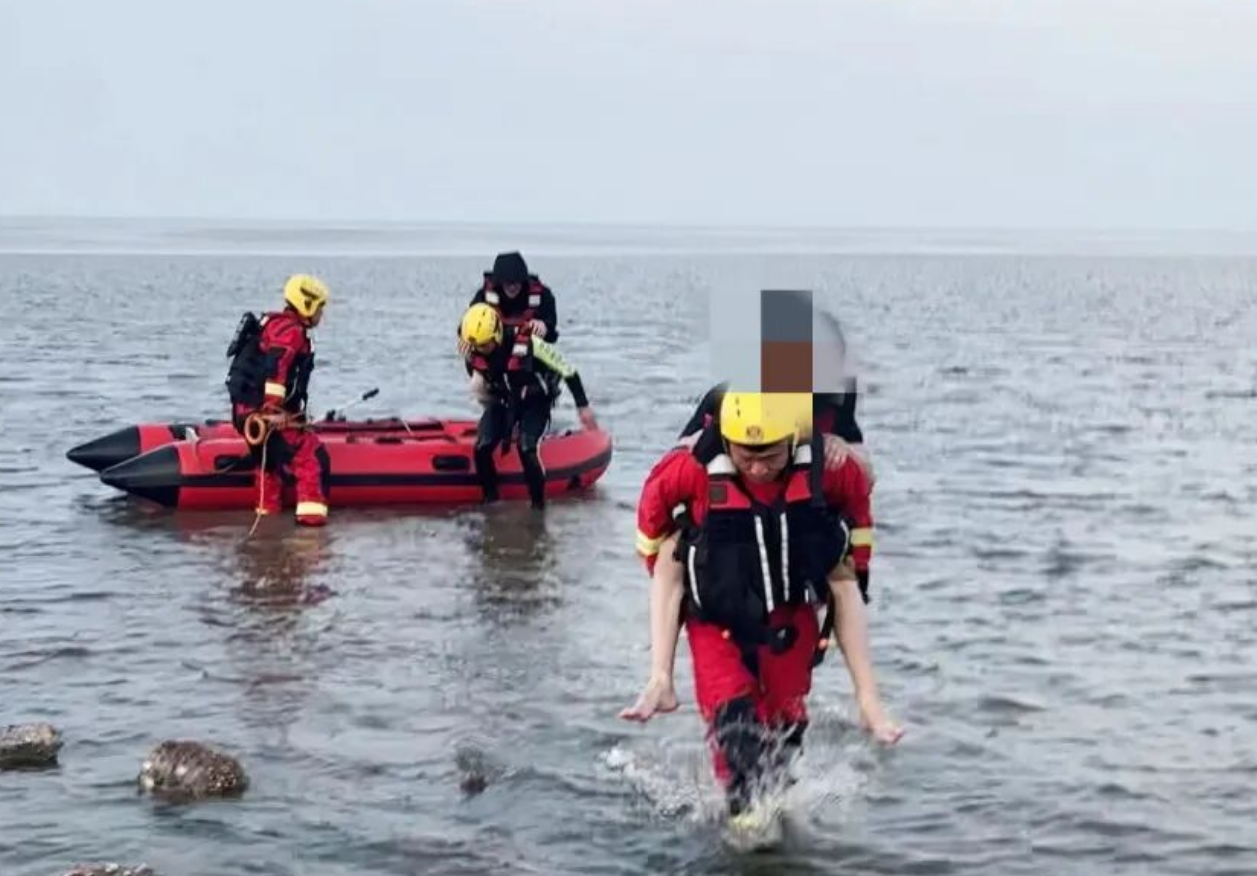 近日,东营市消防救援局指挥中心接到求助:两名群众在金泥湾景区海边赶海游玩时未留意潮汐变化,海水快速上涨淹没退路,两人被困离岸约100米的浅滩区域,周围水深约1.6米,无法自行上岸,并且水位持续升高,情况危急。