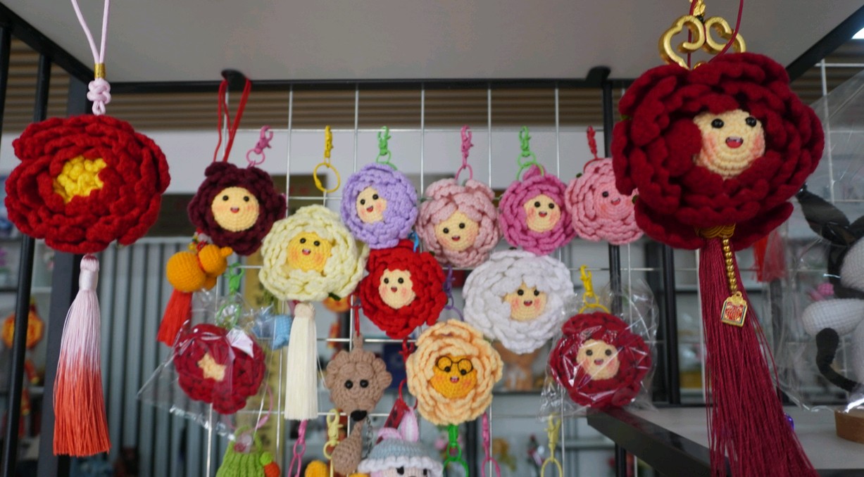 “技法是固定的,新作品要先构思出来再去制作。”张惠灵说。但将平面的设计图转化为立体的钩织公仔,并非易事。为了保留菏泽牡丹盛放柔美形态,同时贴合年轻审美,张惠灵和团队反复试验。针法松紧度的把控、花瓣弧度的呈现、Q版人偶比例的拿捏……每一个细节都在传统针法基础上反复打磨、不断调整。