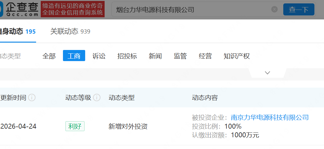 企查查显示,近日,烟台力华电源科技有限公司(下称“烟台力华电源”)以1000万元认缴出资额在南京成立一家全资子公司——南京力华电源科技有限公司(下称“南京力华电源”)。