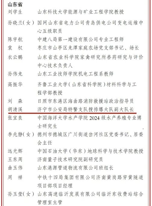 济宁市公安局特警支队搜排爆大队副大队长胡清溪被授予“新时代青年先锋”