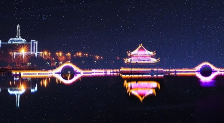 夜幕降临,“六点水公园”便换上浪漫的盛装。“月上柳梢头”,居民们三五成群,踏着步道悠然散步。太阳能路灯与天上星光交相辉映,恍惚间想起郭沫若的《天上的街市》,“远远的街灯明了,好像闪着无数的明星”。石拱桥上的霓虹灯点亮,如彩带倒映水中,把夜空与水面织成五彩锦缎;廊桥的霓虹闪烁迷离,似暗夜精灵舞动旋律;水中央观景亭灯火通明,远远望去,如梦似幻。晚风裹挟着水汽拂过脸庞,一日疲惫尽数消散,只余满心惬意。