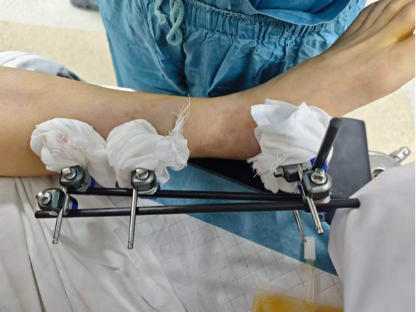 在生命体征稳定、感染受控后,救治转入骨折重建阶段。3月13日,刘涛主任团队成功完成高难度骨盆重建手术,在粉碎性骶骨中精准置入4枚骶髂螺钉。3月20日和24日,团队又先后完成左胫腓骨远端骨折内固定术和右髋臼陈旧性骨折内固定术,同步完成神经探查松解与抗生素人工骨植入。三次手术顺利收官。