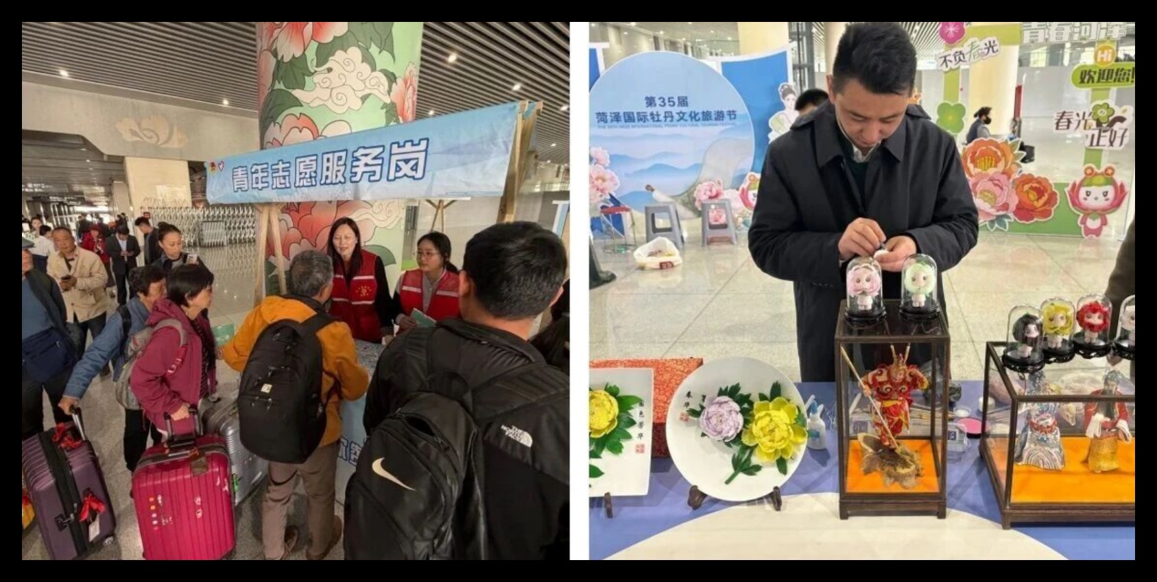 牡丹节会期间,在菏泽高铁东站出站口,鲁西新区团委推出的“花式宠客”志愿服务,成了外地游客抵达菏泽的第一份惊喜。除了沉浸式的传统文化体验,志愿者们还为出站旅客提供问询引导、路线推荐、行李帮扶、秩序维护等全流程贴心服务,耐心解答游客关于牡丹观赏、交通出行、食宿安排的各类疑问,细致讲解菏泽文旅特色,实打实解决游客出行“最后一公里”的需求。