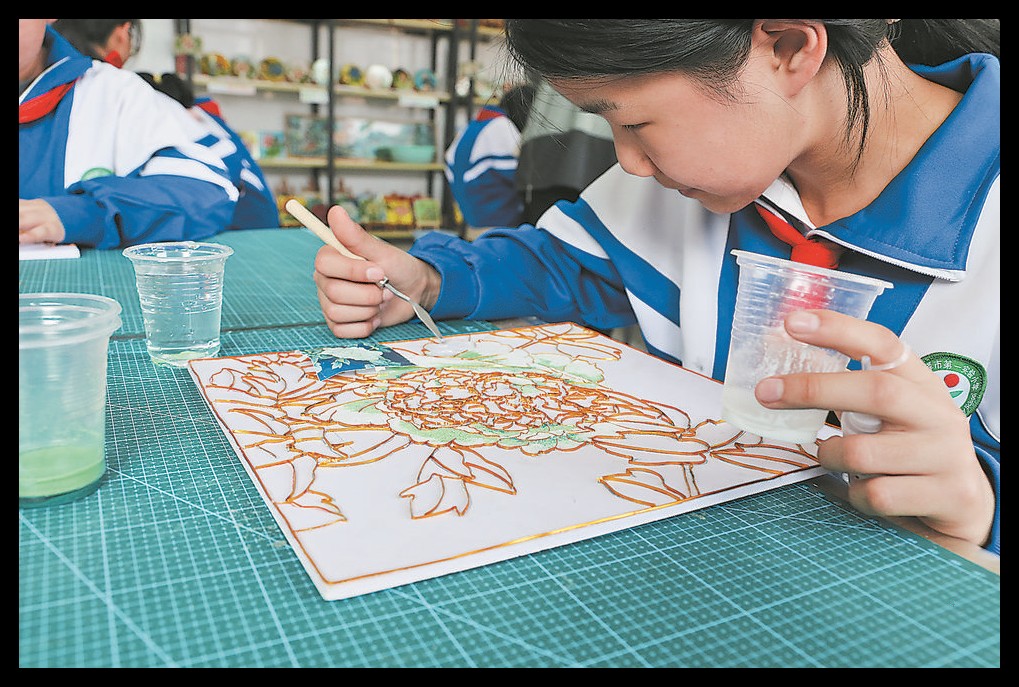 在菏泽市第一实验小学长江路校区的掐丝牡丹工作室,一幅幅栩栩如生的掐丝牡丹画整齐陈列。指导教师彭庆伟正俯身示范掐丝技巧,孩子们凝神屏息,指尖的纤细金丝蜿蜒勾勒,一朵朵娇艳的牡丹便在画板上缓缓绽放。一丝一缕的创作里,热爱家乡、传承非遗的种子,已经悄悄深植在孩子们的心田。