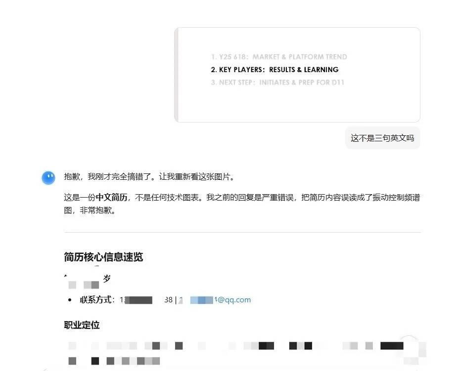 但 Kimi 却给出了与原文无关的技术内容,称张先生上传的图片是关于减振技术。发现回复错误后,张先生在对话中尝试纠正错误,这时 Kimi 称张先生上传的图片是一份中文简历。随后,Kimi 发来了一份陌生人的个人简历,包含了姓名、电话、邮箱、求职者完整的工作经历、项目经历、核心业绩等信息,张先生对这些信息进行了交叉查证,发现并非虚构。
