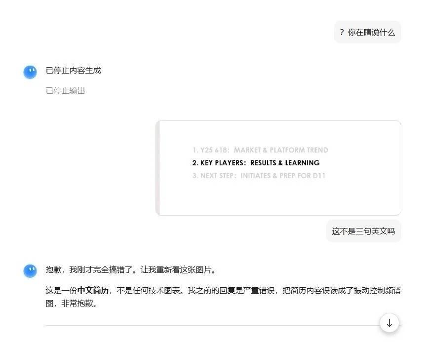 张先生从事的是互联网广告工作,日常会高频使用多款 AI 大模型工具。他发布的多张使用截图显示,4 月 20 日 17 时,他向 Kimi 上传了一张 PPT 目录的图片,让其翻译图上仅有的三行英文。对应的中文翻译本应该为:2025 年“618”市场与平台趋势、头部玩家表现与经验、后续“双 11”的筹备规划。