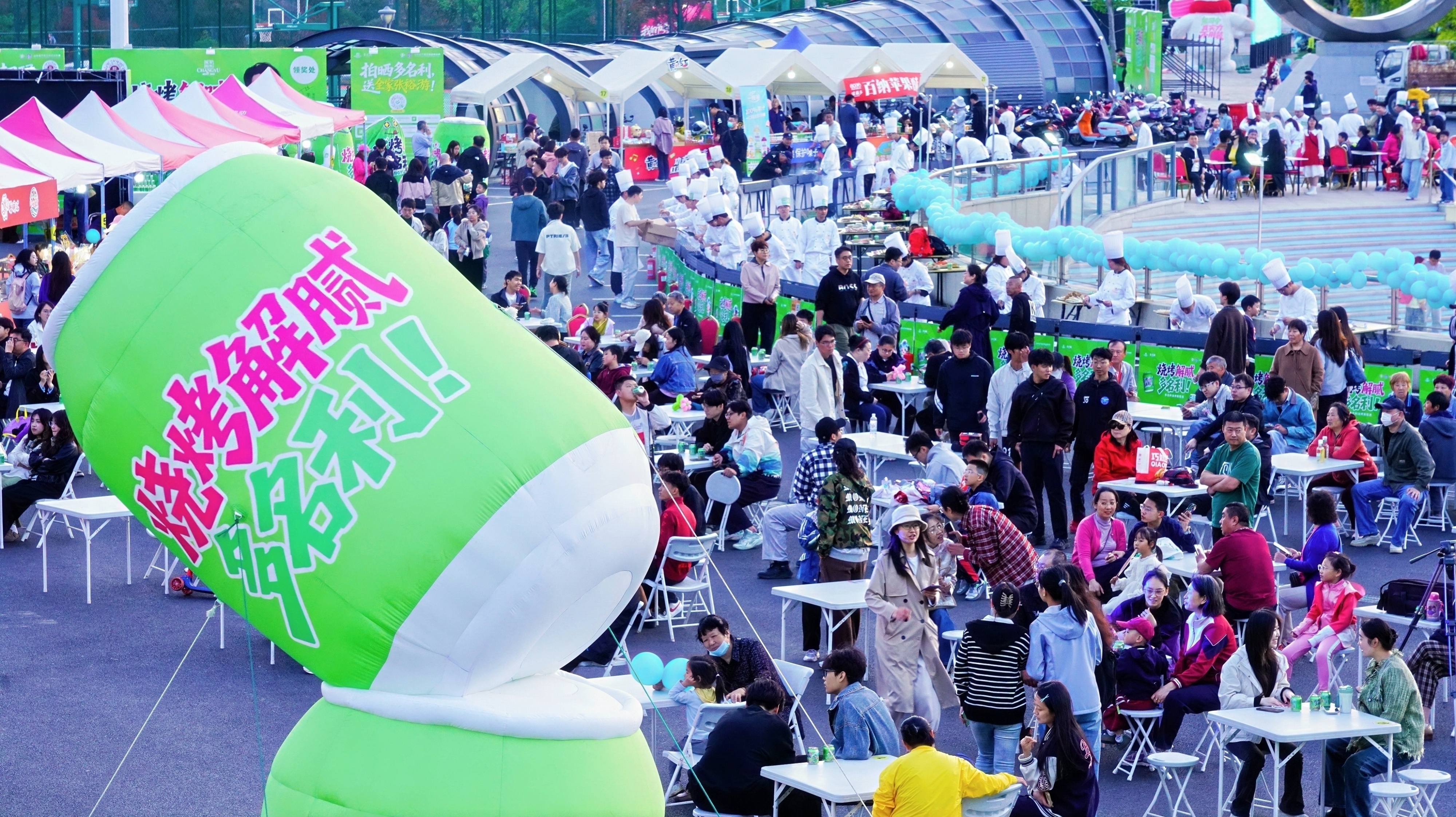 当晚,烟台莱山区上市里人头攒动,超长烤炉一字排开,百名厨师头戴高帽、身着制服同步开烤,滋滋冒油的烧烤香气与震耳欲聋的助威声交织,将运动的激情与周末的畅快推向顶点。