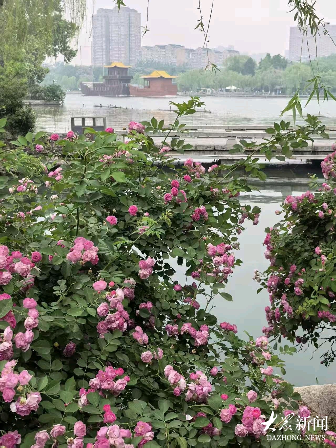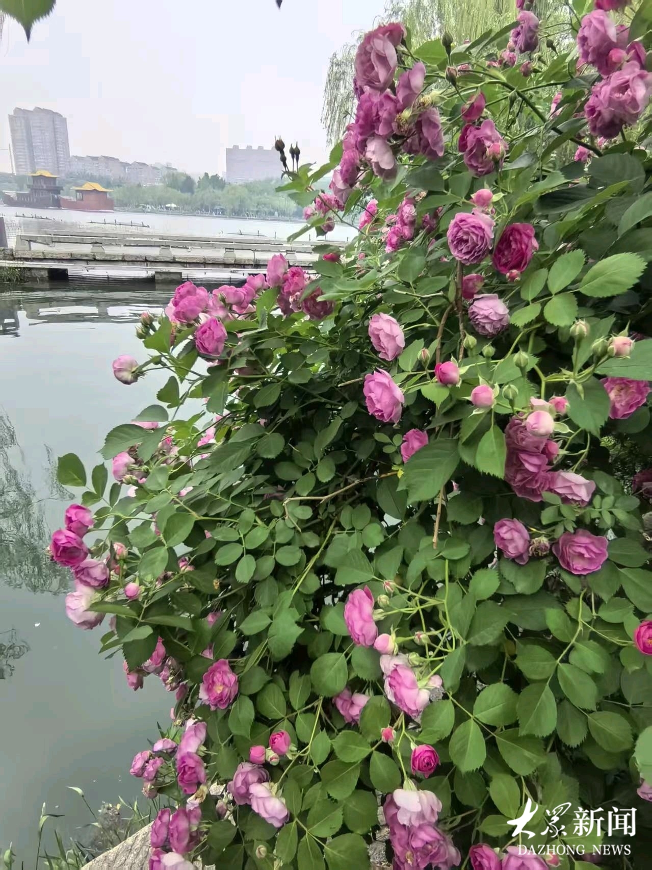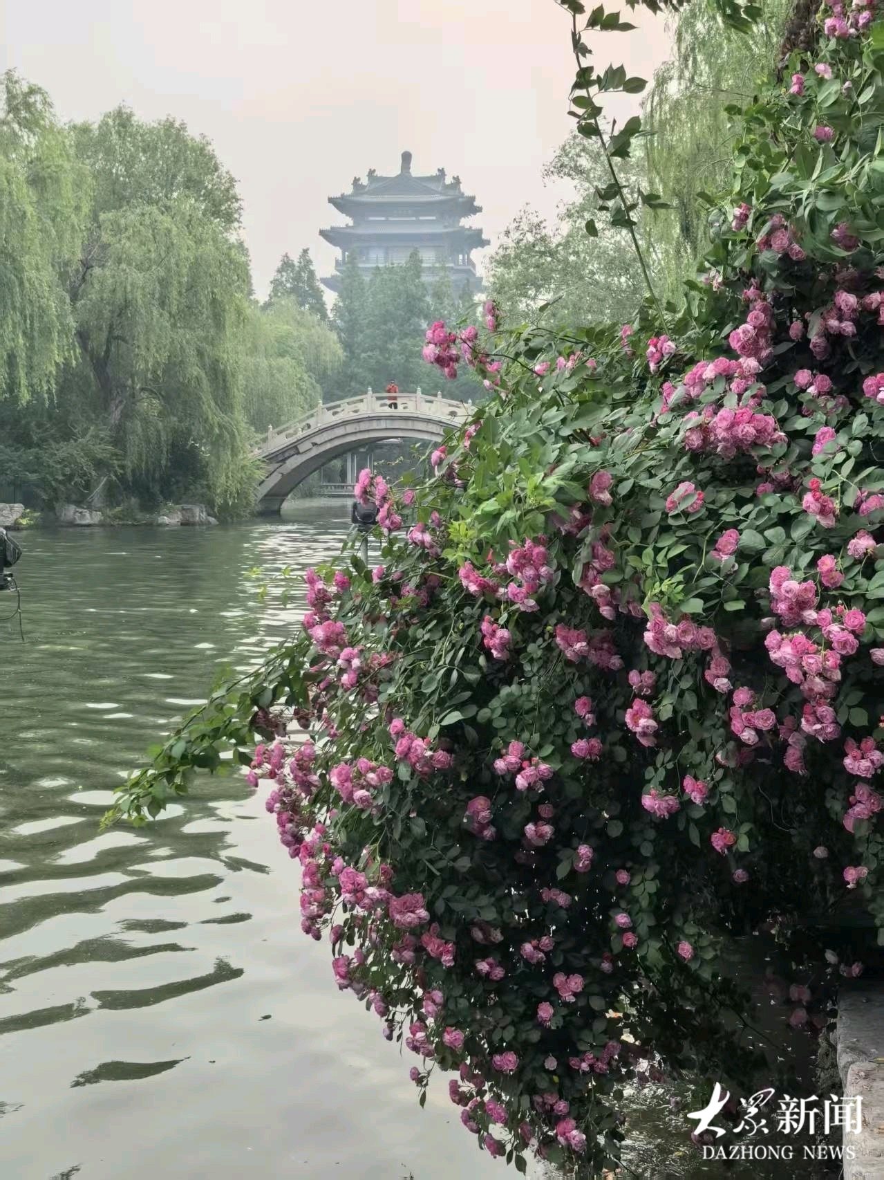 四月晴光,蔷薇怒放,湖波映石桥痕漾。近日,济南大明湖景区也披挂上了暮春的限定浪漫款——蔷薇花墙。凑近嗅香,蔷薇娇艳绽放,清香四溢。粉紫色的花朵层层叠叠,缀满枝头,如锦缎一般从桥头垂落,形成浪漫的花瀑长廊。又如美人笑靥般,与湖面相映成趣,美到窒息了!(大众新闻记者梁利杰摄影:殷玉国)