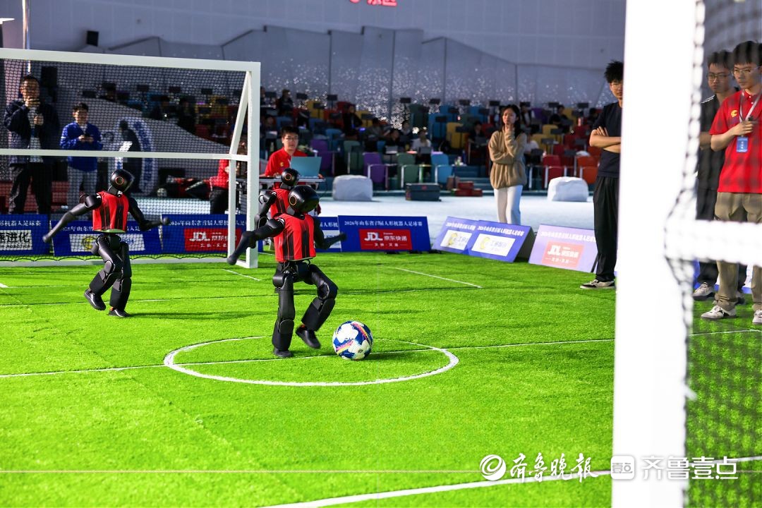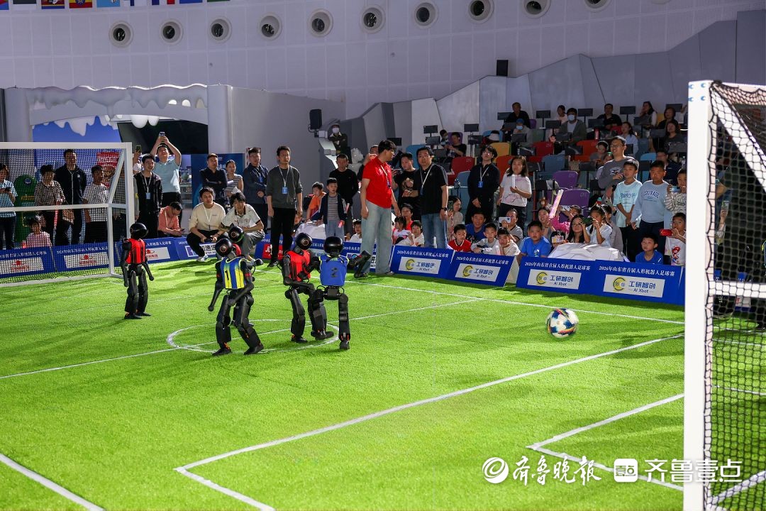 带球快跑,瞄准时机一脚射门,开赛不到10分钟,来自青岛大学钢铁前锋代表队的1号机器人球员踢进了全场第一个球,观众席爆发出热烈的欢呼声。4月26日上午,山东省首届人形机器人足球赛在历下区开赛。本次赛事由历下区委人才工作领导小组办公室指导,山东省自动化学会、历下区科协联合主办,汇聚省内多所高校科创力量,以“科技+体育”融合创新的形式,打造了一场人形机器人领域的前沿竞技赛事。