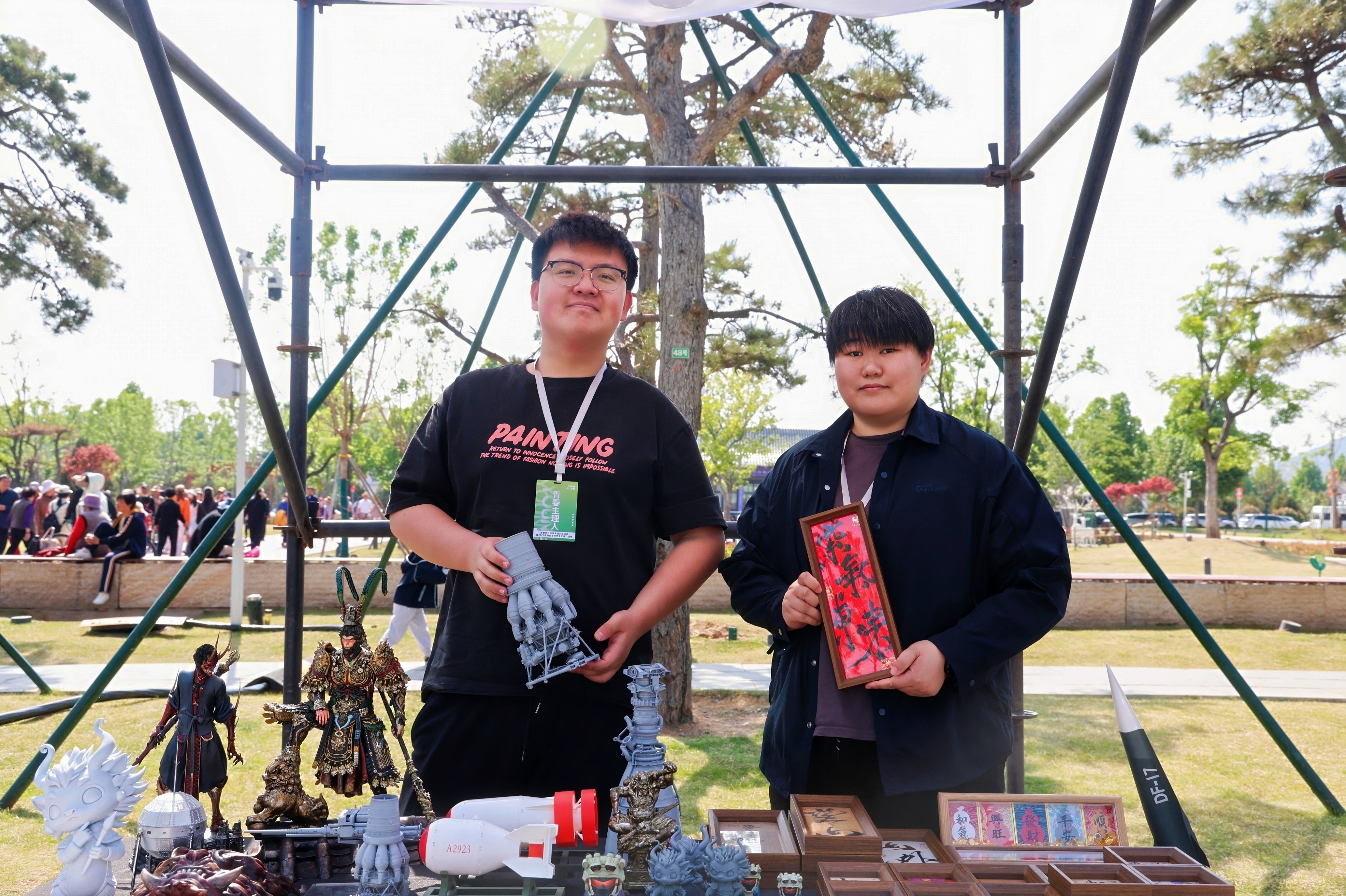岱北文化广场中轴步道两侧,青春的气息与非遗的厚重交织在一起。来自驻泰10余所高校的大学生们,将书本上冰冷的文字转化为可触摸、可体验的文创成果,成为年轻人追捧的“新宠”。