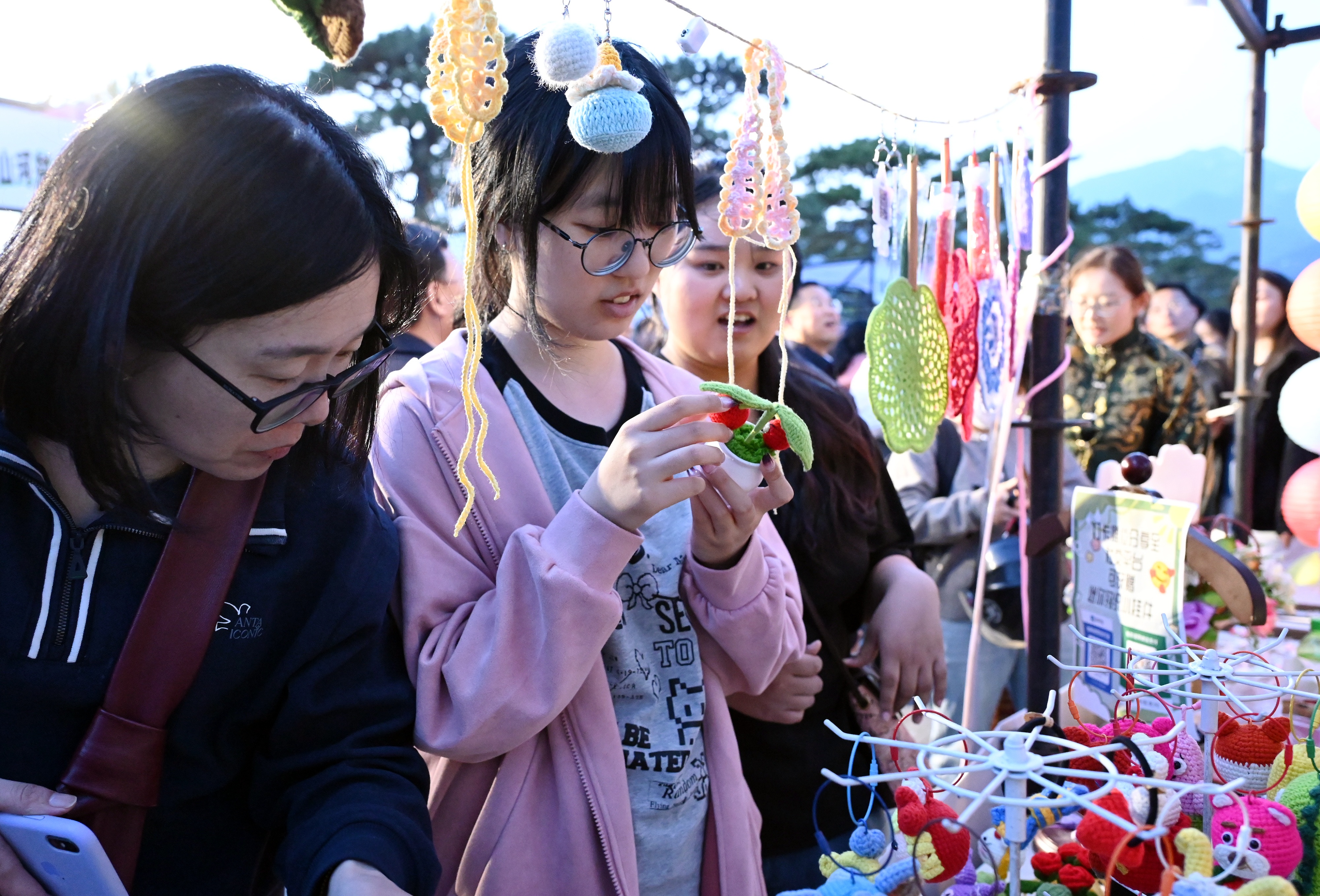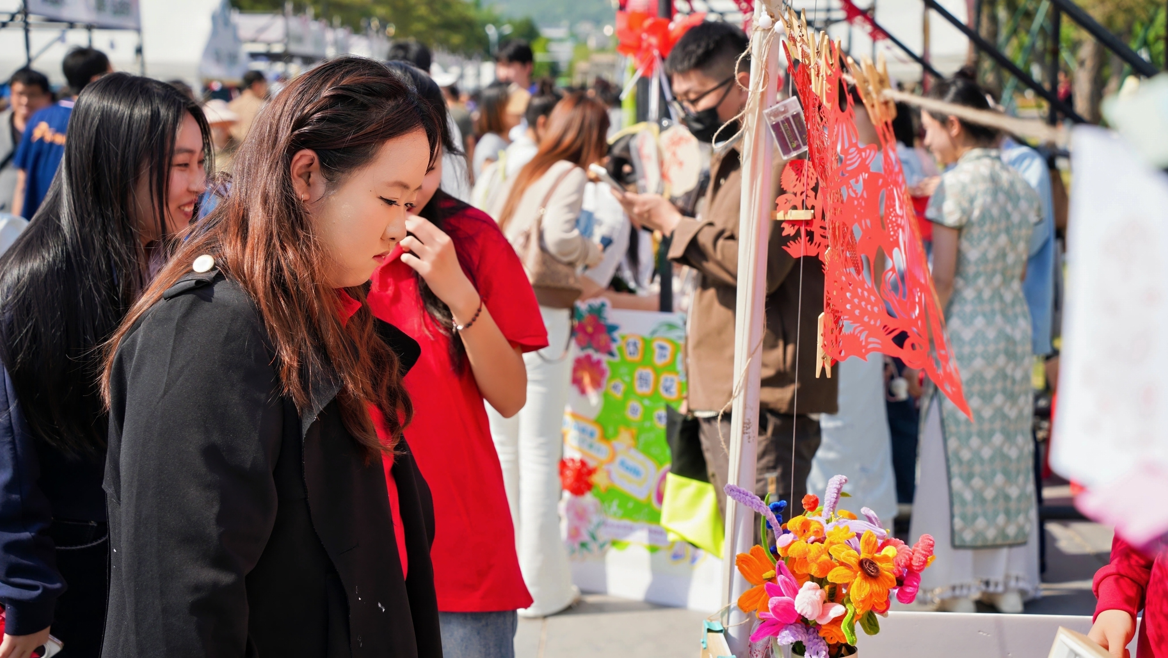 旁边的“有凤来仪非遗绒花工坊 ”体验区同样人气爆棚。“我们兼顾传统与简易,适配大家的动手能力,让更多人能亲手体验‘指尖上的匠心’。”来自山东服装职业学院的大学生主理人赵雨欣介绍道。现场市民在短时间内就掌握了基础技法,打造出属于自己独一无二的绒花手作。