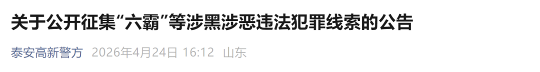 近日,泰安高新警方发布关于公开征集“六霸”等涉黑涉恶违法犯罪线索的公告,详情如下: