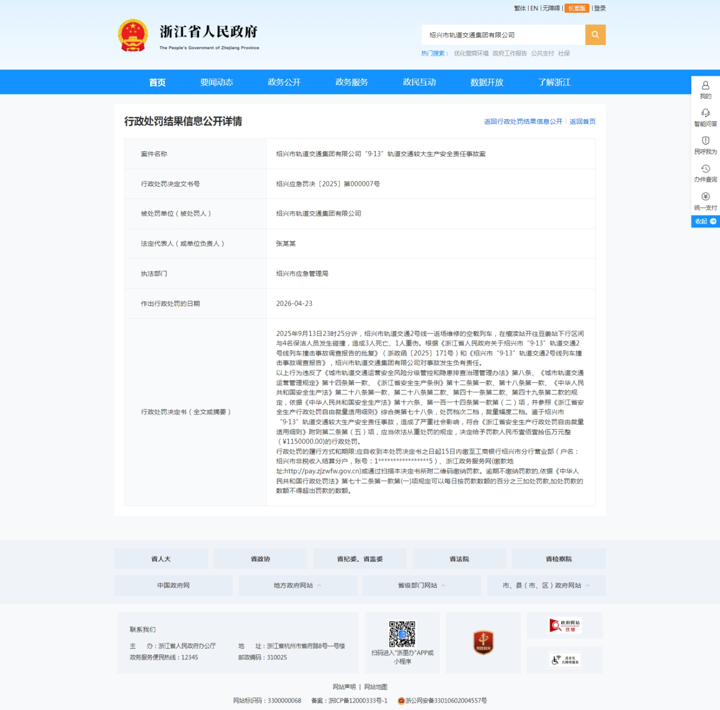 齐鲁晚报·齐鲁壹点记者于浙江省人民政府“行政处罚结果信息公开”栏获悉,4月23日,其公示了绍兴市轨道交通集团有限公司(下称“绍兴轨道交通集团”)“9.13”轨道交通较大生产安全责任事故案的行政处罚结果,行政处罚决定书文号:绍兴应急罚决(2025)第000007号。