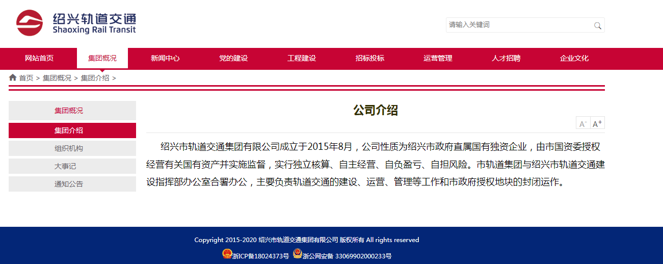 据绍兴轨道交通集团官方网站介绍,公司性质为绍兴市政府直属国有独资企业,由市国资委授权经营有关国有资产并实施监督,实行独立核算、自主经营、自负盈亏、自担风险。绍兴轨道集团与绍兴市轨道交通建设指挥部办公室合署办公,主要负责轨道交通的建设、运营、管理等工作和市政府授权地块的封闭运作。