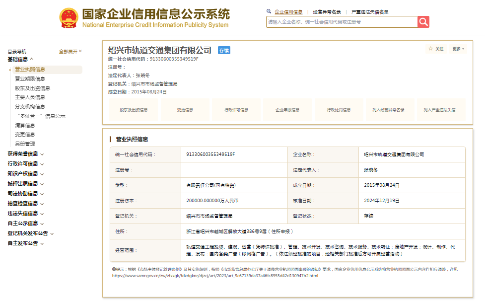 国家企业信用信息公示系统显示,绍兴市轨道交通集团有限公司成立于2015年,注册资本200000万元人民币,法定代表人为张晓冬。
