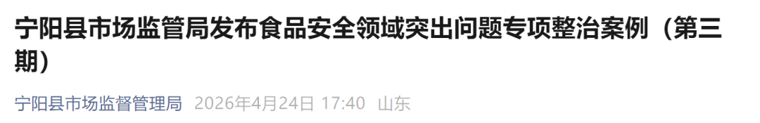 4月24日,宁阳县市场监督管理局发布食品安全领域突出问题专项整治案例(第三期),详情如下: