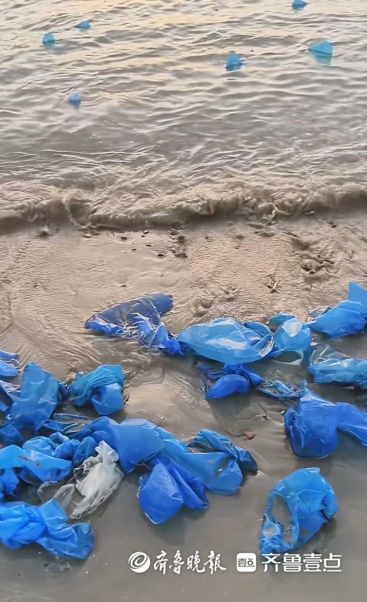 从视频中可以看到,这些蓝色垃圾少量在沙滩上方,多数分布在海滩边,绵延数十米都有这些“蓝色印记”,甚至有些已经被冲进海里。