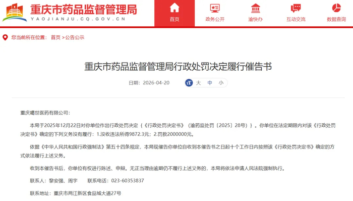 因噶世医药未按期履行处罚义务,4月20日,重庆市药监局发布催告书,要求其10个工作日内缴清罚没款,逾期将依法申请法院强制执行,彰显监管部门“零容忍”的坚定态度。