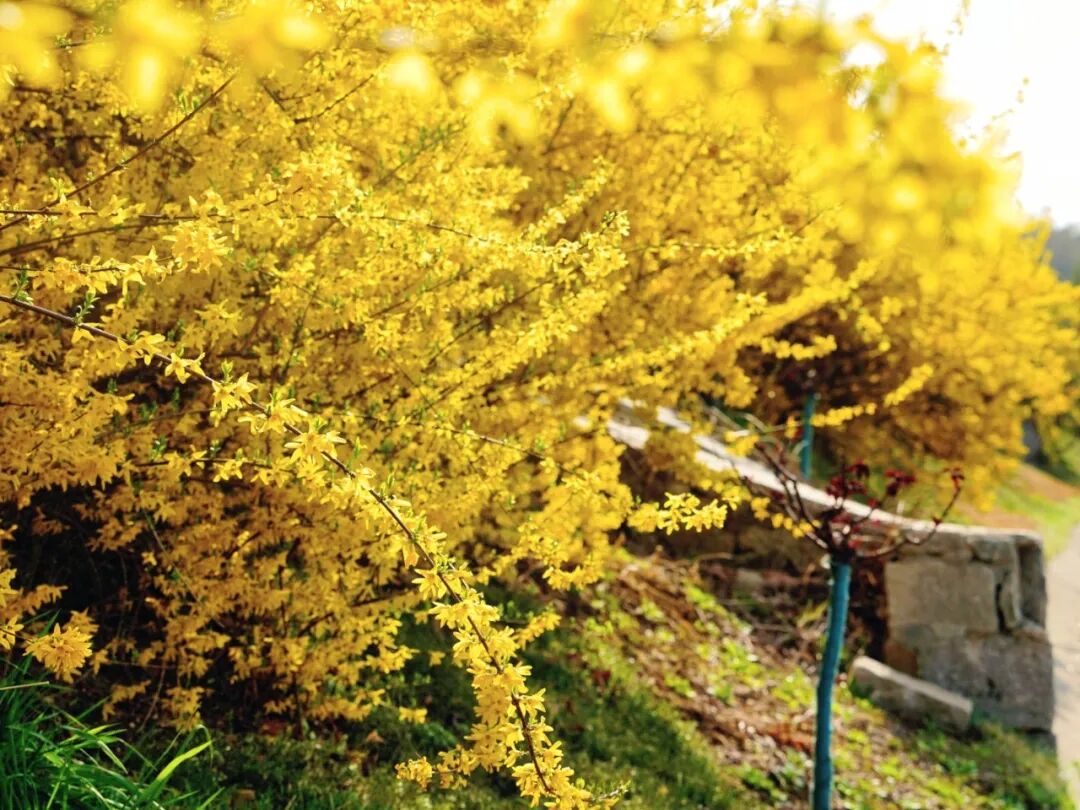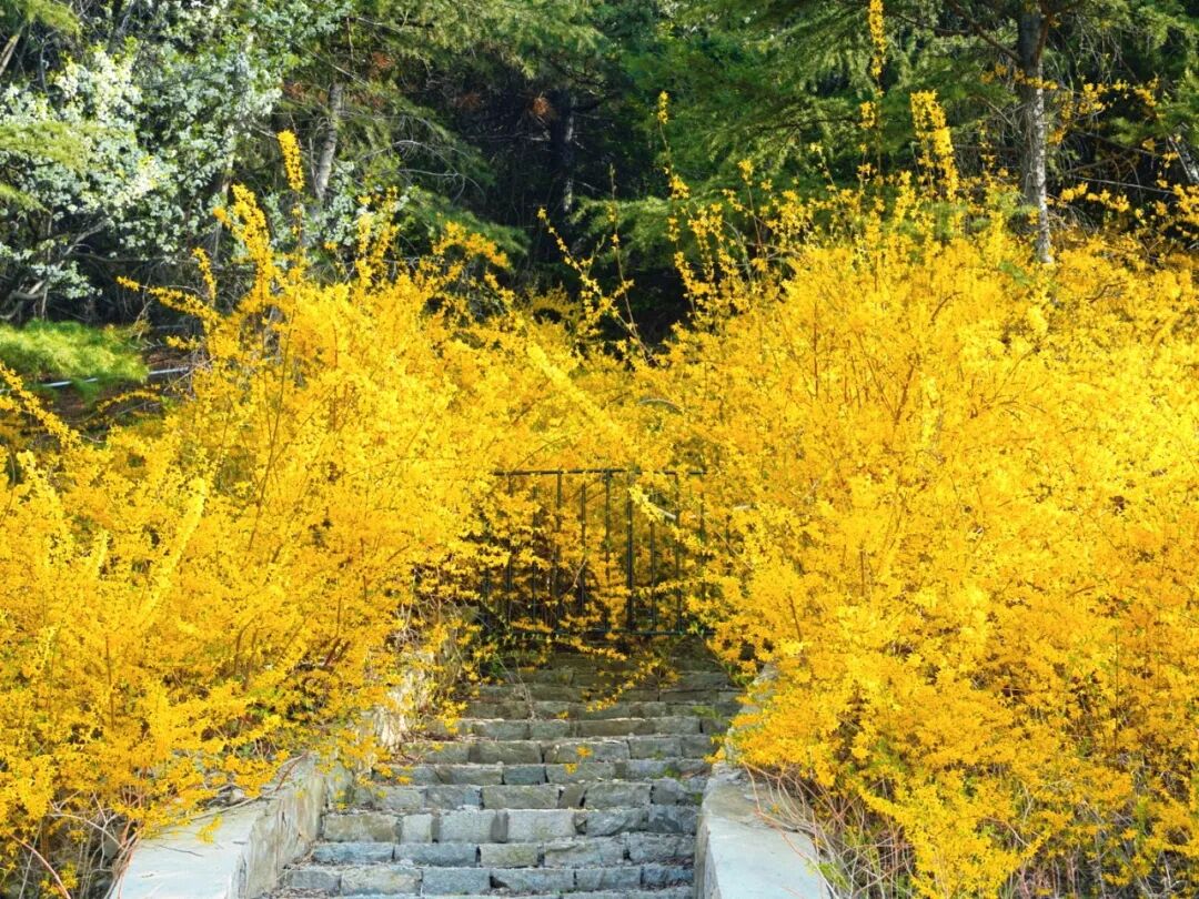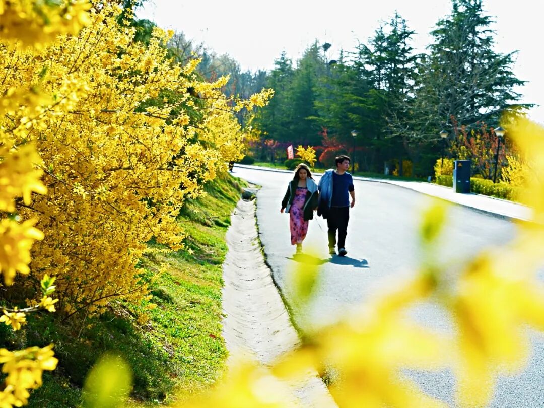 金黄的连翘最是惹眼,沿着山径、依附廊柱肆意舒展,明亮的黄色点缀山间,与古色古香的建筑相映,格外鲜活。