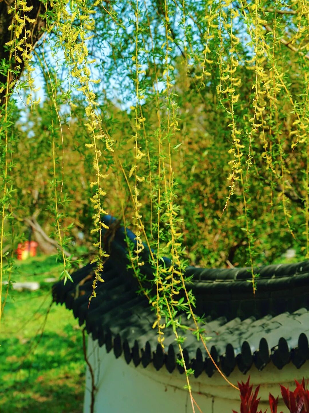 新抽的柳丝带着鹅黄嫩绿的生机,柔软地垂在水面,与岸边的繁花、古建相映成趣,清雅又灵动。