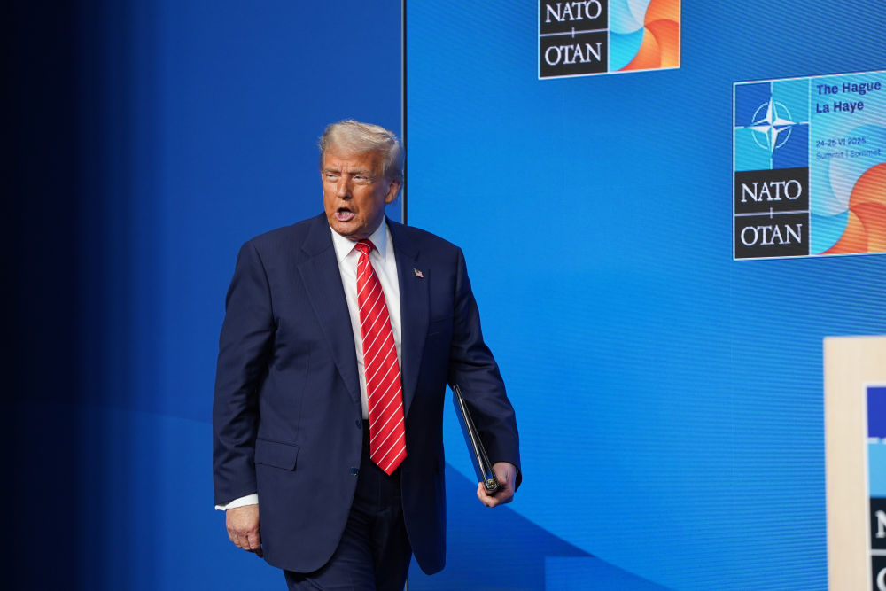 2025年6月25日,在荷兰海牙,美国总统特朗普在北约峰会期间出席新闻发布会。 特朗普2025年重返白宫后不断向北约“加压”:宣布切断美国对乌克兰的直接军事援助,威胁从北约成员国丹麦手中夺取格陵兰岛,还施压北约盟友提高军费……美国和以色列2月28日对伊朗发动军事打击后,伊朗事实上关闭了霍尔木兹海峡,特朗普恼火于北约盟友对此“不出力”,一些北约成员国还限制美军使用其领空或军事基地。