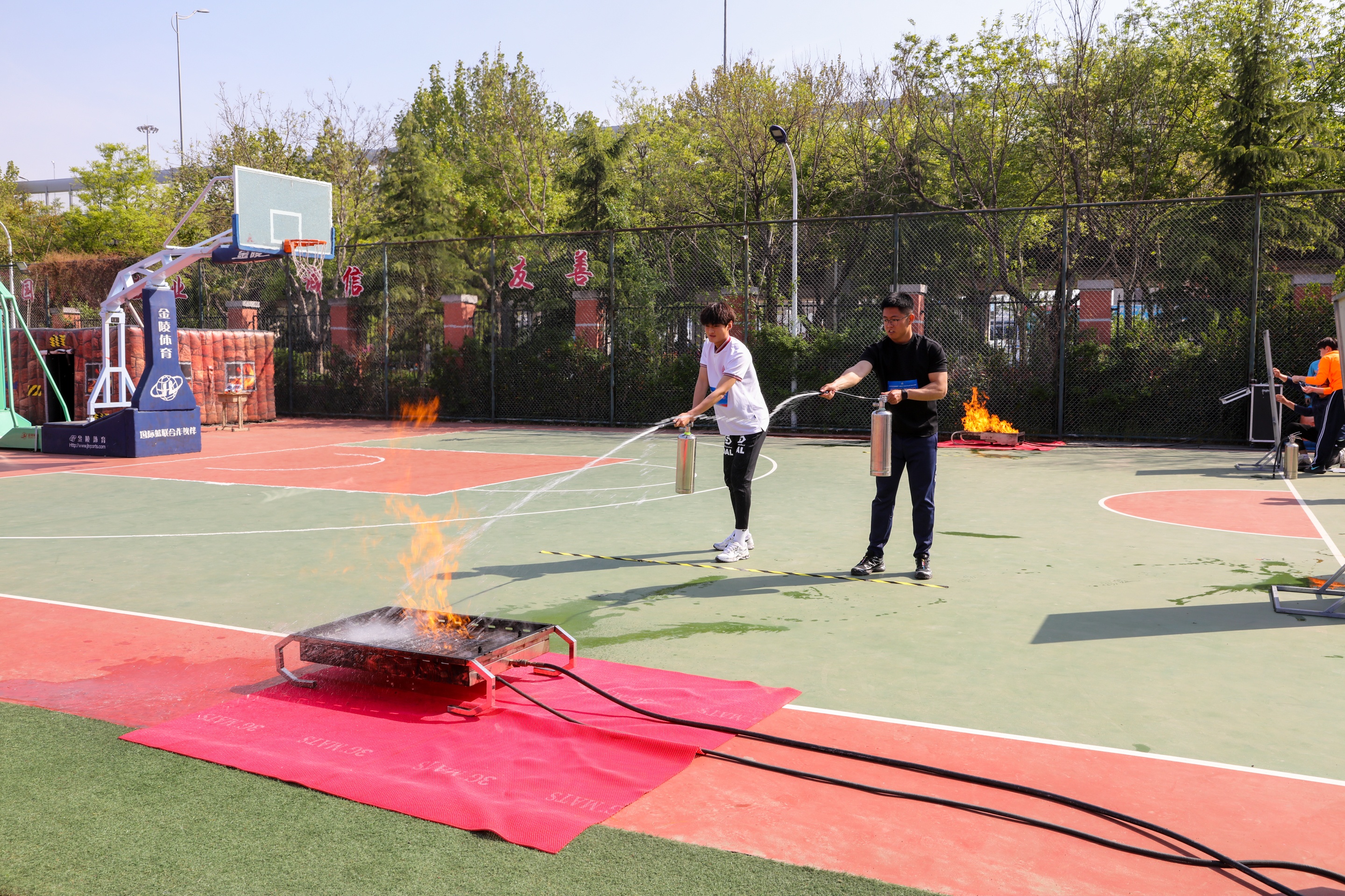 “火场救援”为团体项目,每队6人协同完成消防水带连接、真火扑救、伤员搬运三个环节:队员依次抛接水带、连接消防栓与分水器、接通水枪形成完整供水线路。随后一人持灭火器扑灭真火。最后六人合力将假人移上担架并转运至安全区。全过程环环相扣,考验团队的应急配合与实战能力。