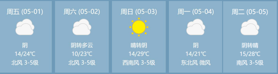 从天气预报来看,今年“五一”假期期间,我市天气晴转阴,气温在10℃-29℃之间,昼夜温差较大。