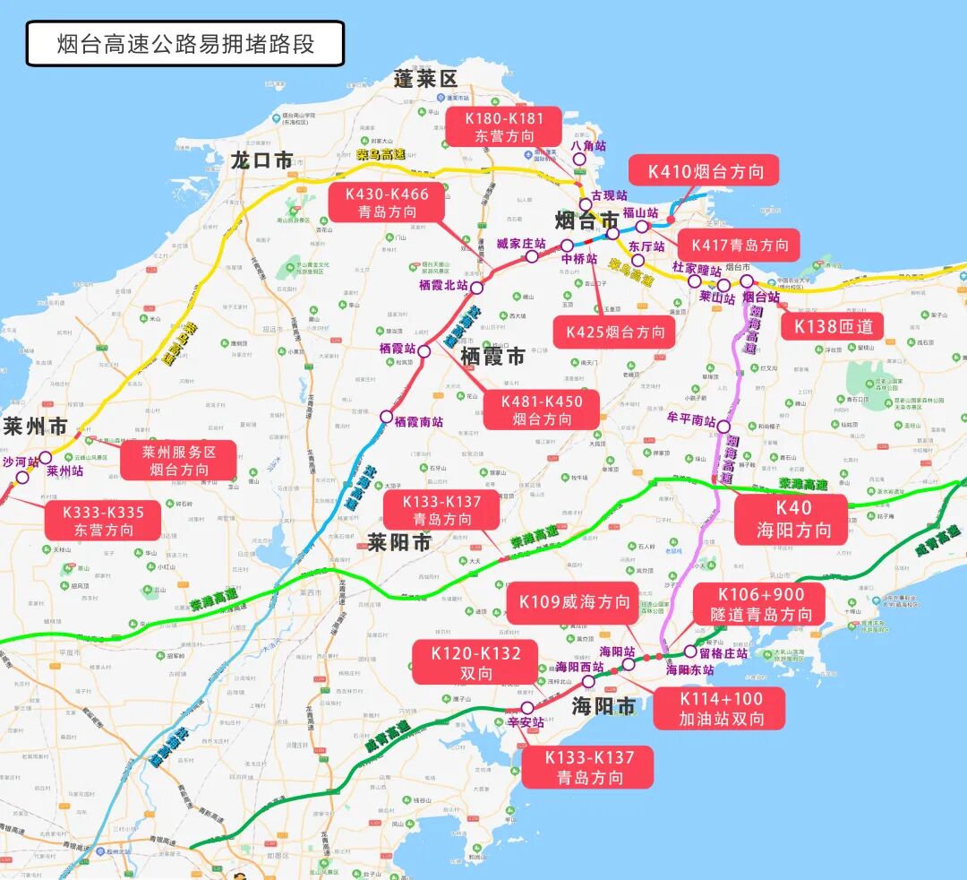 受节日集中出行影响,预计沈海高速K410烟台方向、K417青岛方向、K425烟台方向、K430-K466青岛方向、K481-K450烟台方向,烟海高速K40海阳方向,威青高速K120-K132双向、K133-K137青岛方向、K114+100加油站双向、K106+900隧道青岛方向、K109威海方向,荣潍高速K133-K137青岛方向,荣乌高速K180-K181东营方向、K333-K335东营方向、莱州服务区烟台方向、K138匝道以及主要收费站等点位将会迎来大流量。