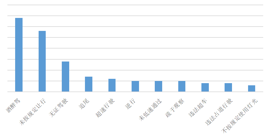 酒醉驾、未按规定让行、无证驾驶、追尾、超速行驶等违法行为是引发事故的主要原因。