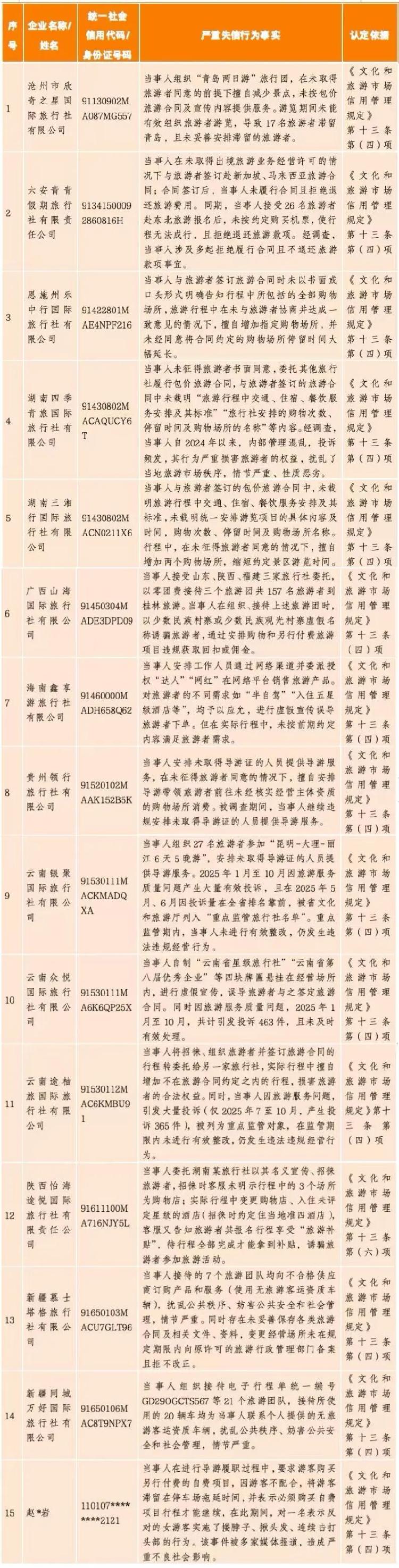 旅游市场秩序集中整治严重失信主体典型名单(2026年第一批)