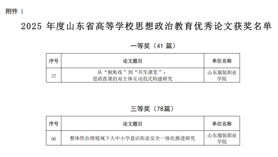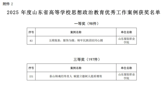 山东服装职业学院申报的论文《从“独角戏”到“共生课堂”:思政首课的双主体互动范式构建研究》和工作案例《五维筑基,服饰为媒,铸牢民族团结同心圆》获评一等奖,论文《整体性治理视域下大中小学意识形态安全一体化推进研究》和工作案例《泰山铸魂经纬育人赋能立德树人提质增效》获评三等奖。