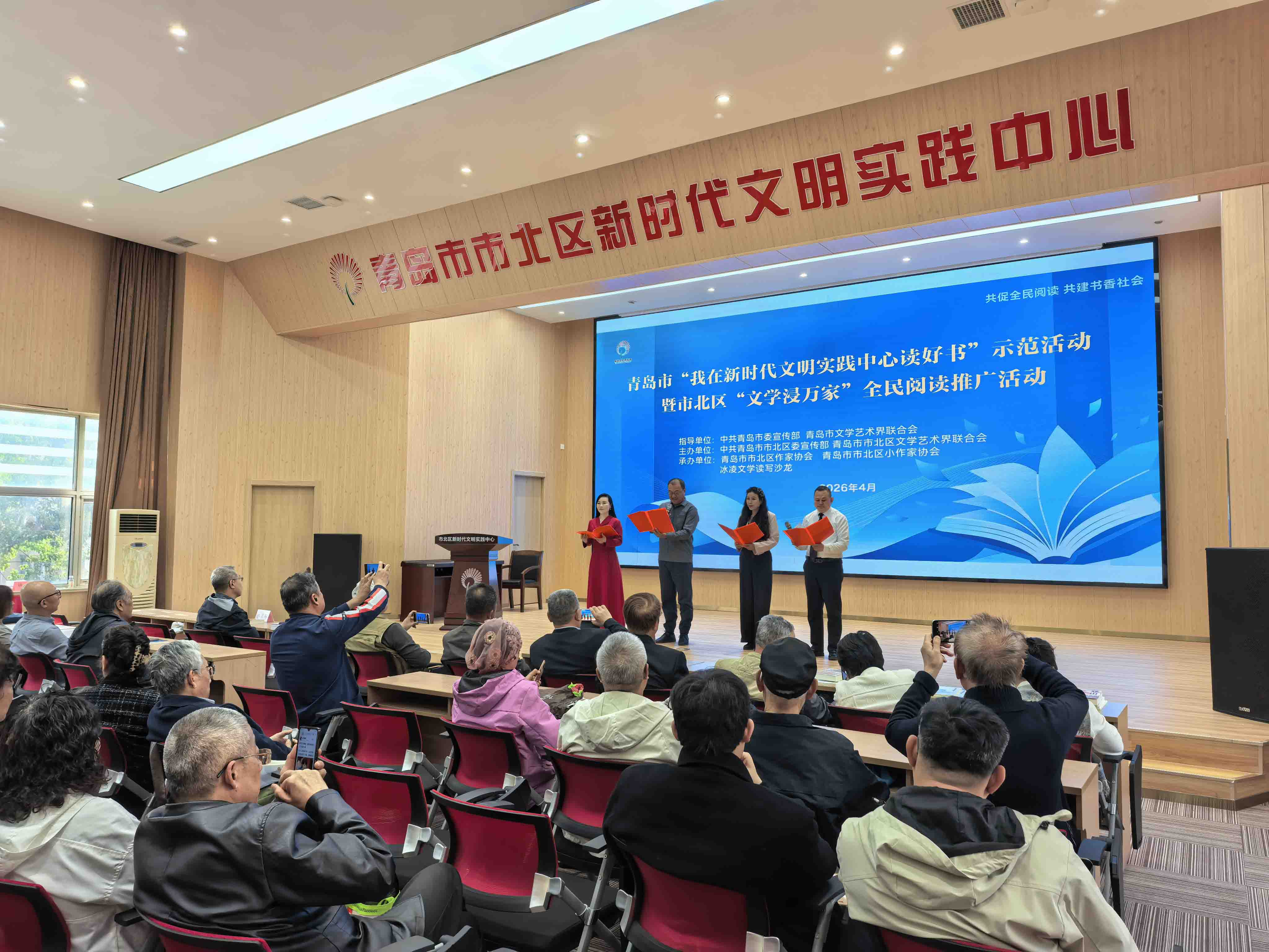 为营造爱读书、读好书、善读书的浓厚氛围,推进书香社会建设,4月26日,青岛市“我在新时代文明实践中心读好书”示范活动暨市北区“文学浸万家”全民阅读推广活动在市北区新时代文明实践中心报告厅举办,市北区作家协会会员代表、社区居民代表80余人参加。