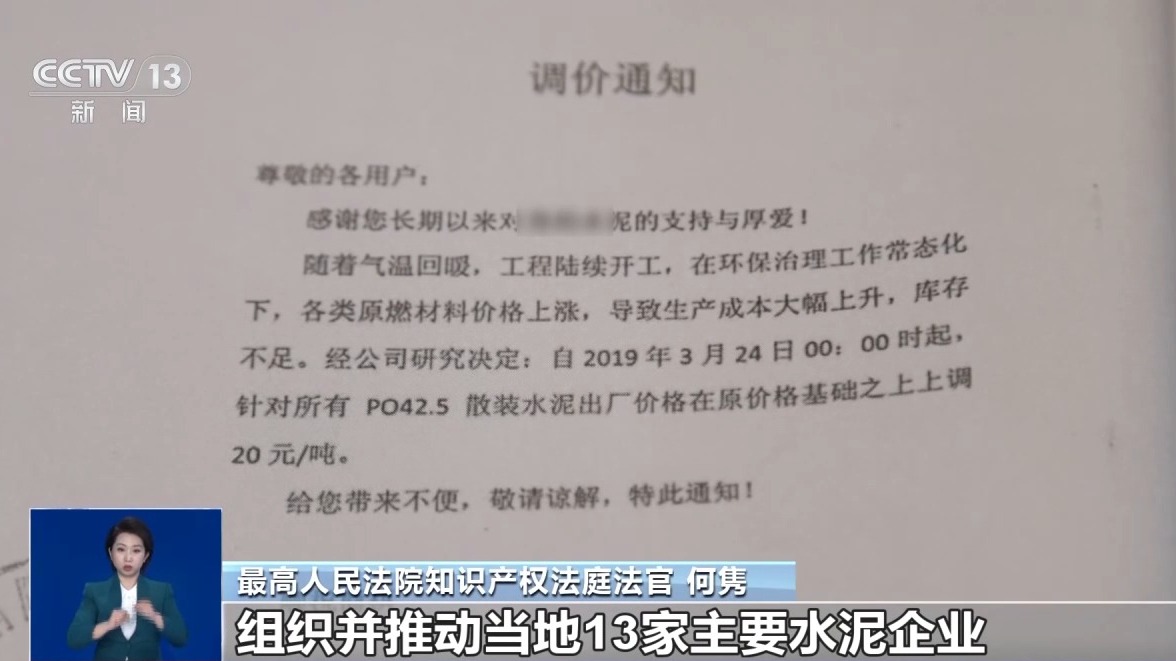 最高人民法院知识产权法庭法官 何隽:在本案中,水泥协会通过组建微信群、召集行业会议、组织线下交流会议等多种方式,组织并推动当地13家主要水泥企业,统一对水泥价格进行了调整。