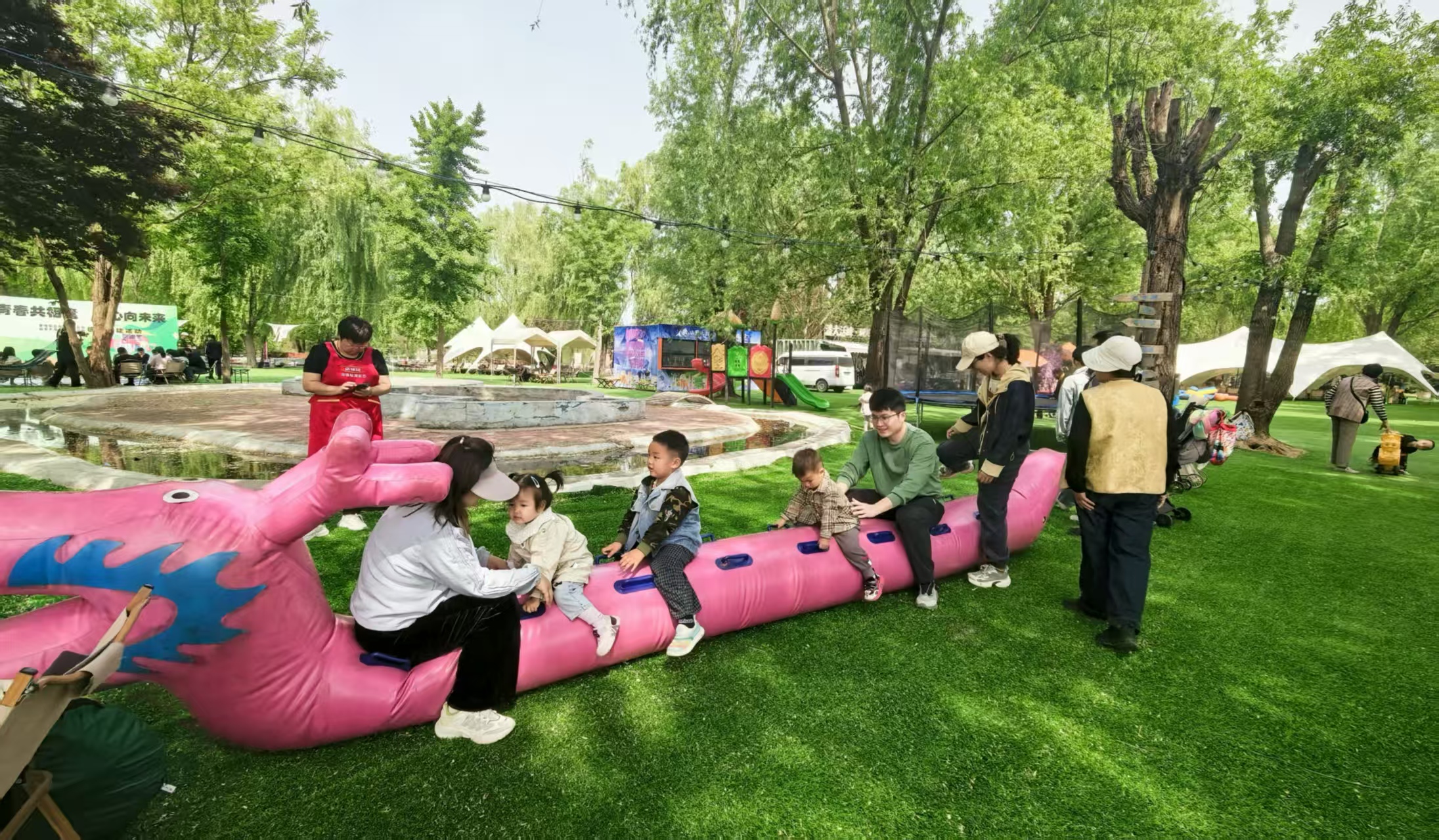 春风拂面,彩鸢起舞。亲子携手奔跑放风筝,五彩风筝乘风翱翔。吊床休憩、趣味充气游戏轮番上演,孩子们在自然中嬉戏游玩、释放天性,处处充满欢声笑语。