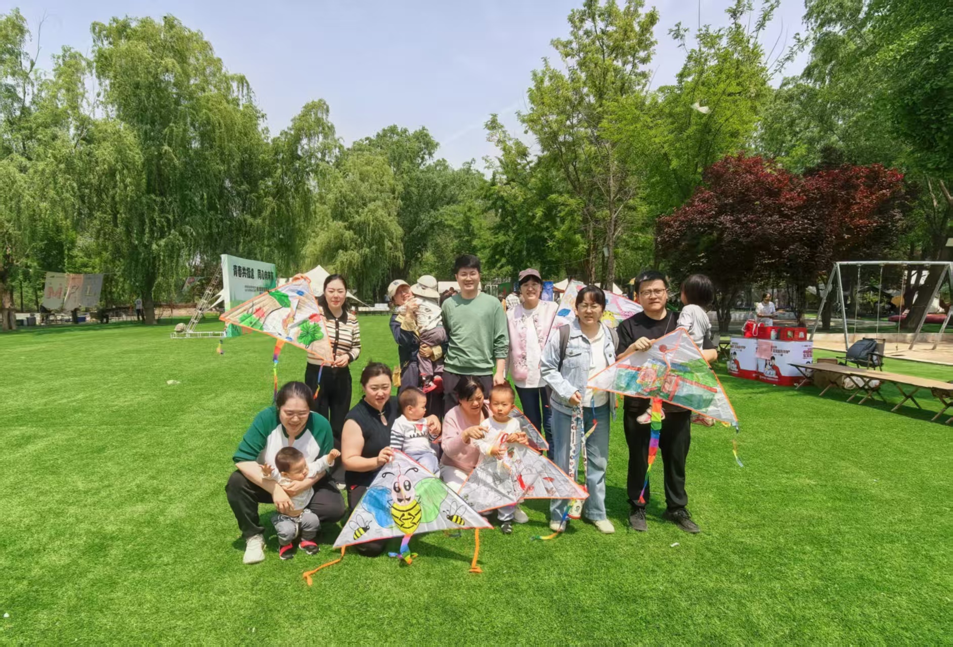 家长与宝贝们齐聚露营草坪,开启春日专属亲子之旅。大家共同参与手绘风筝DIY创意手工,大手小手齐落笔,随心涂色创作,尽享温馨陪伴时光。
