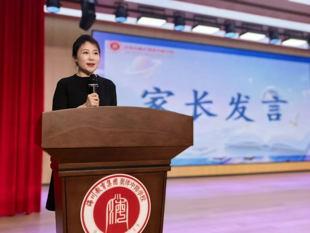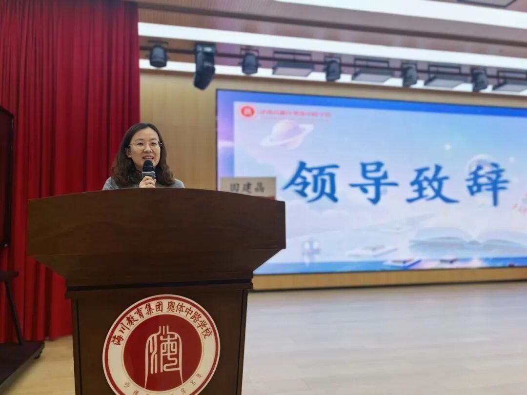 济南高新区奥体中路学校执行校长田建晶致辞,她鼓励同学们以书为舟、以好奇为桨,勇敢提问、积极探索,在阅读中种下科学种子,向着星辰大海勇敢出发!