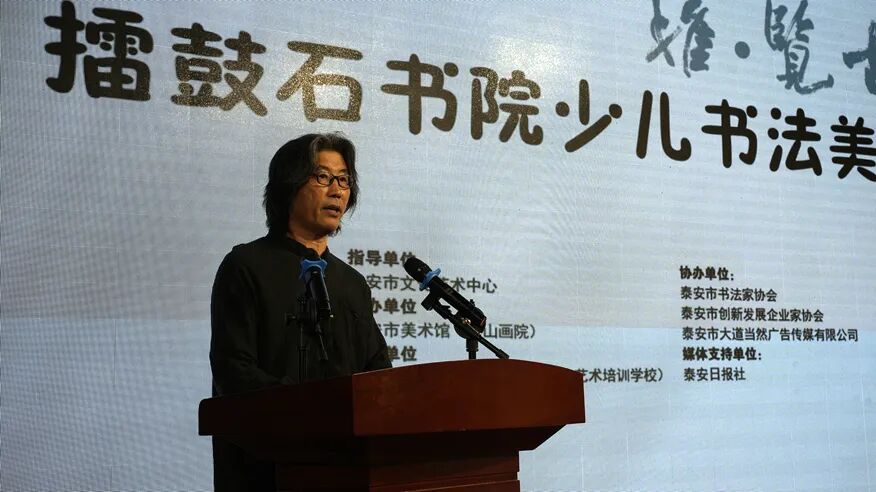 山东省青年书法家协会主席、山东艺术学院书法系主任、副教授贾长庆致辞贾长庆表示,擂鼓石书院至今十年间,书院始终以专业书画教学为根基,以弘扬中华优秀传统文化为己任,在艺术教育之路上稳步耕耘、笃行不怠。从初创时的十余名学员,发展到如今拥有三家校区、六百余名在校学生,累计培育学员近三千人。今天展出的80余幅书法作品以及由500幅小朋友作品组成的10余类美术作品,笔墨灵动、意趣盎然,生动展现了擂鼓石书院的教学成果与艺术追求,擂鼓石书院不仅传授书画技艺,更在潜移默化中培育文化自信、提升审美素养,让青少年在笔墨点染间感受中华传统文化的深厚魅力。