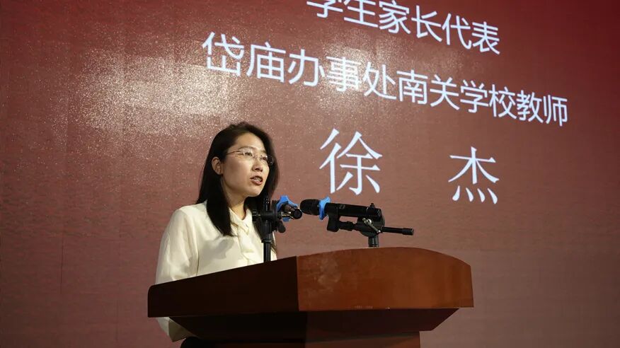 学生家长代表、岱庙办事处南关学校教师徐杰发言