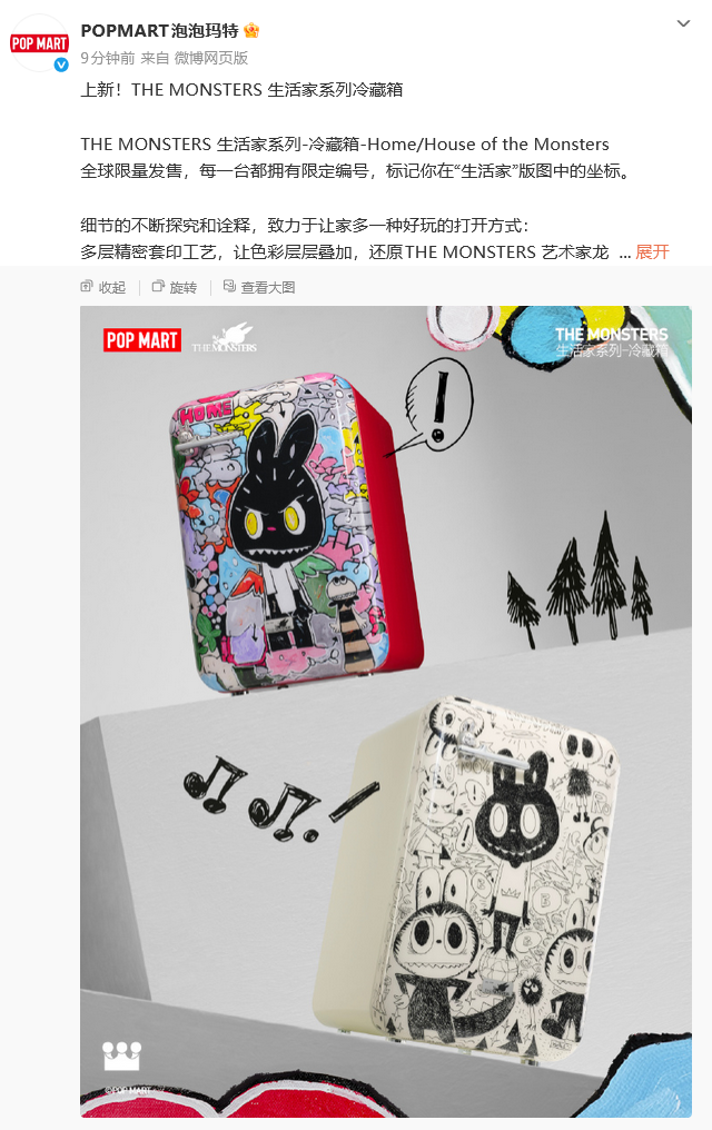 4月24日,泡泡玛特在社交平台正式发布首款家电产品THE MONSTERS生活家系列冷藏箱(下文统称:LABUBU冰箱),并宣布将于4月30日22点正式发售。 据悉,本次发布的LABUBU冰箱分为Home款和House of the Monsters款两个版本,两个版本均为全球限量发售999台,售价为5999元,每一台都拥有限定编号。
