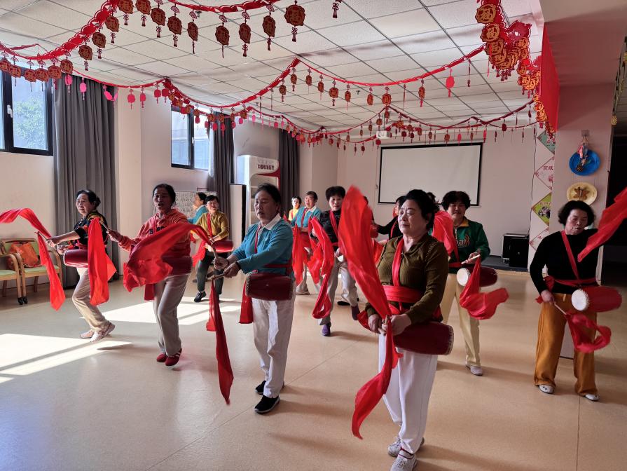 活动现场气氛热烈、暖意融融。老年爱好者齐聚一堂,用铿锵鼓点、灵动舞姿欢度佳节。红绸翻飞,大家步伐整齐、动作舒展,抬手、跳跃、转身一气呵成,尽显活力。一张张笑容满面的脸庞,一个个矫健有力的身影,跳出了新时代老年人老有所乐、老有所为的精神风貌,传递出积极乐观的生活态度。