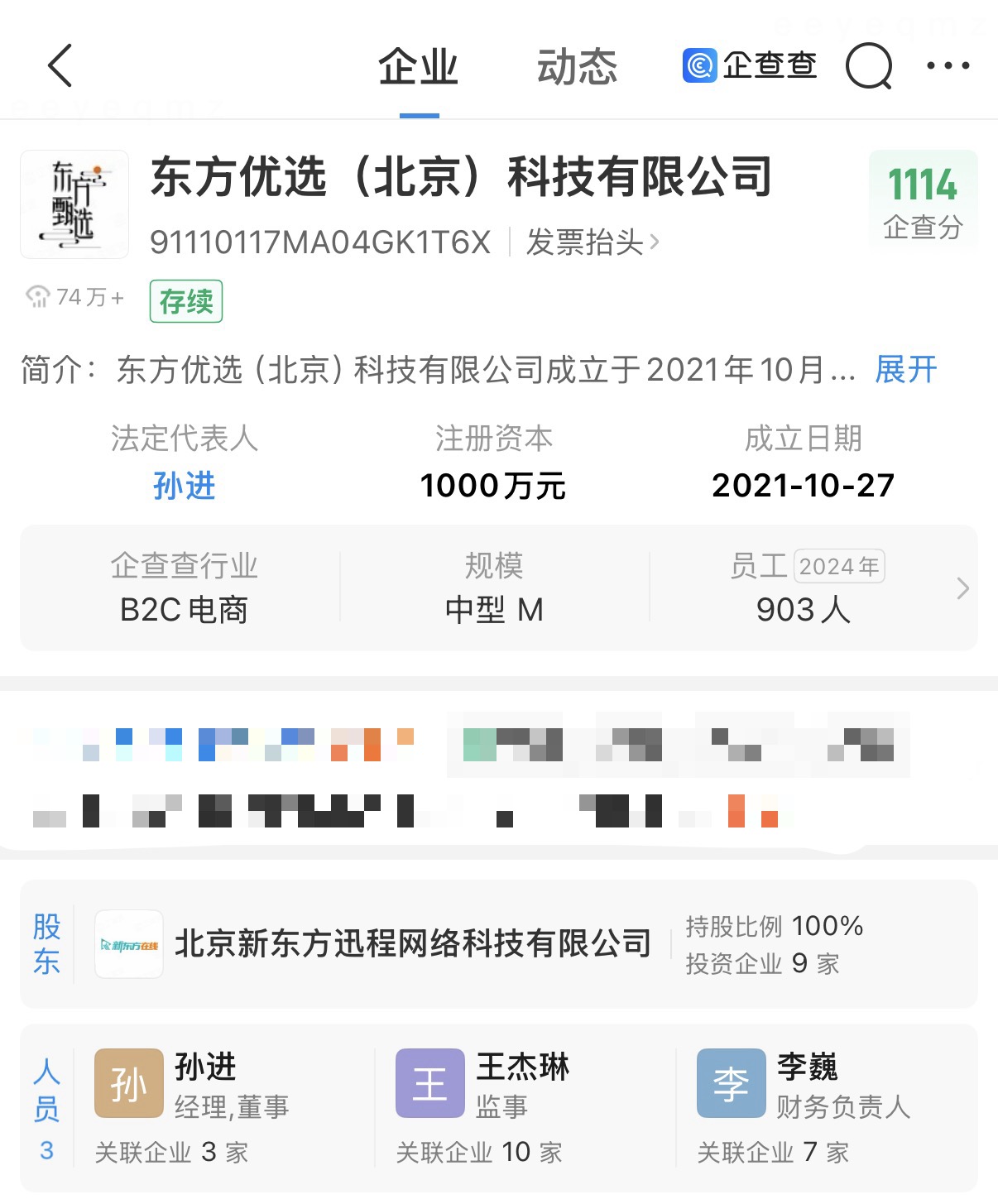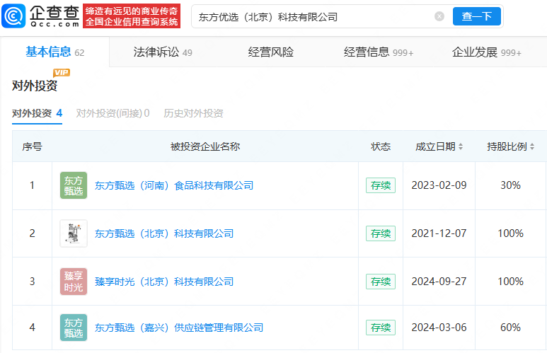 此前,东方甄选发布2026年中期报告,公司表示,计划启动长期招聘计划,招揽优秀直播主及专业人才。同时,将招聘符合品牌定位且具备直播经验的外部专业人士。企查查APP显示,东方甄选关联公司东方优选(北京)科技有限公司成立于2021年10月,法定代表人为孙进,由北京新东方迅程网络科技有限公司全资持股。该公司对外投资4家公司,包括东方甄选(河南)食品科技有限公司、东方甄选(北京)科技有限公司等。