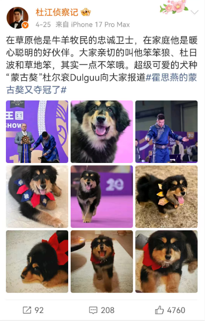 4月24日,在青岛即墨举办的CKU犬展中,霍思燕身着旗袍,牵引着中国第一只完成赛级登记的蒙古獒“杜尔衮”步入赛场。小家伙凭借沉稳的步态、温顺亲人的性格以及出色的服从性,赢得裁判一致青睐,成功拿下特幼组冠军。这也是中国原生犬种——蒙古獒在国际赛场上的首次正式亮相,打破了欧美犬种长期以来的垄断局面。