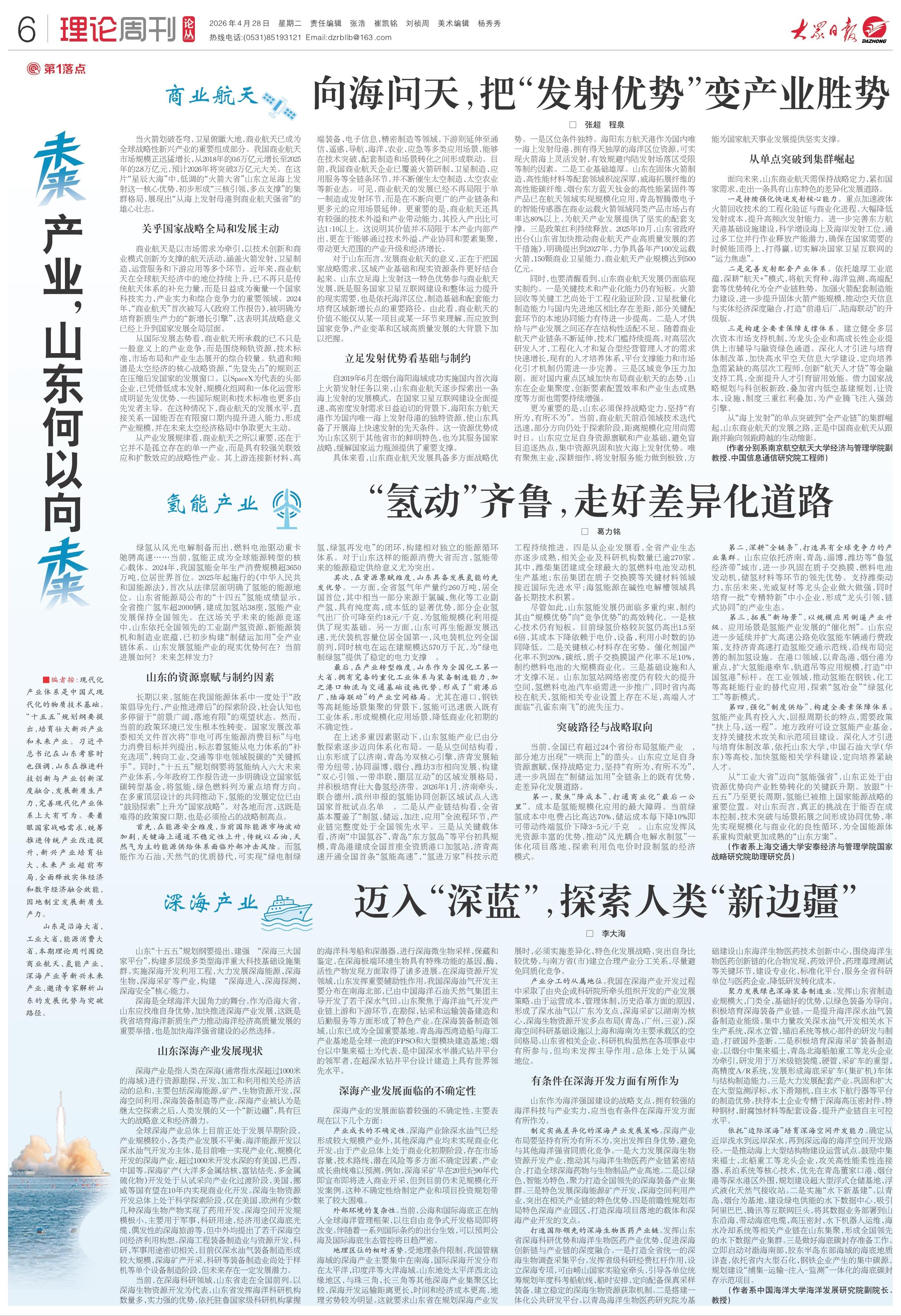 山东是沿海大省、工业大省、能源消费大省,本期理论周刊围绕商业航天、氢能产业、深海产业等新兴未来产业,邀请专家解析山东的发展优势与突破路径。