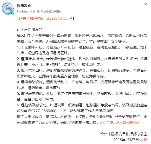 极目新闻记者查询到,钦州市气象台4月27日3时28分、6时30分连续发布了暴雨红色预警信号,据“钦州发布”报道称,27日凌晨到早晨,广西钦州一带遭遇极强降雨,降水量达到271.1毫米,打破当地特大暴雨日纪录和4月单日降水量纪录。随后,广西钦州市防汛抗旱指挥部发文表示,27日,城区因受近十年来最强日降雨影响,部分路段出现积水、内涝险情,提醒居民“非必要不外出”。