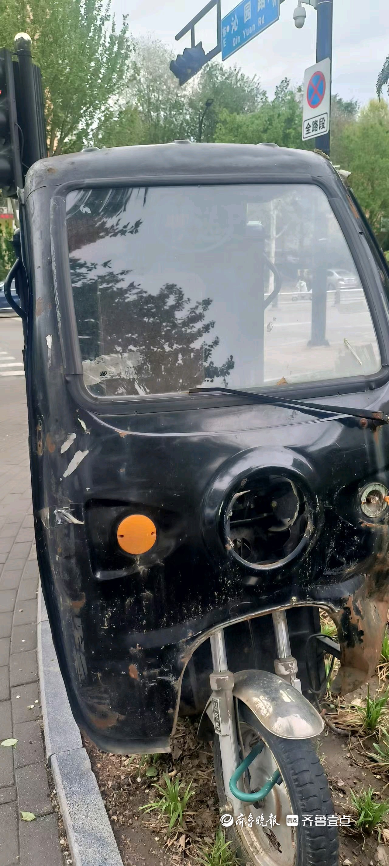 4月27日,情报员“zx00976”向齐鲁晚报官方客户端齐鲁壹点情报站发来一则情报,济南开拓路与沁园路丁字路口西南角的绿化带里停放着一辆废旧三轮车,影响市容市貌,市民呼吁及时清理。